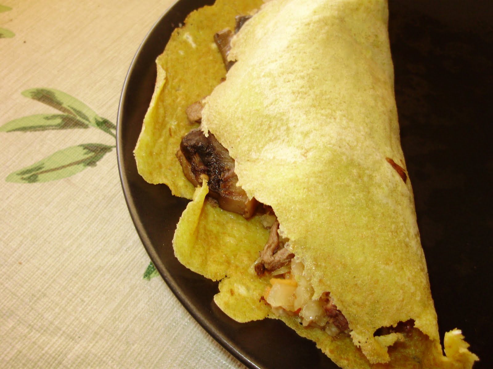 Once the crepes were mixed up, I sliced a mushroom and a small bit of onion and sauteed both in a little butter. When soft I added in the leftover roast (my roast was from antelope but any roast or meat would do). Cooked up a couple of crepes and put it all together.