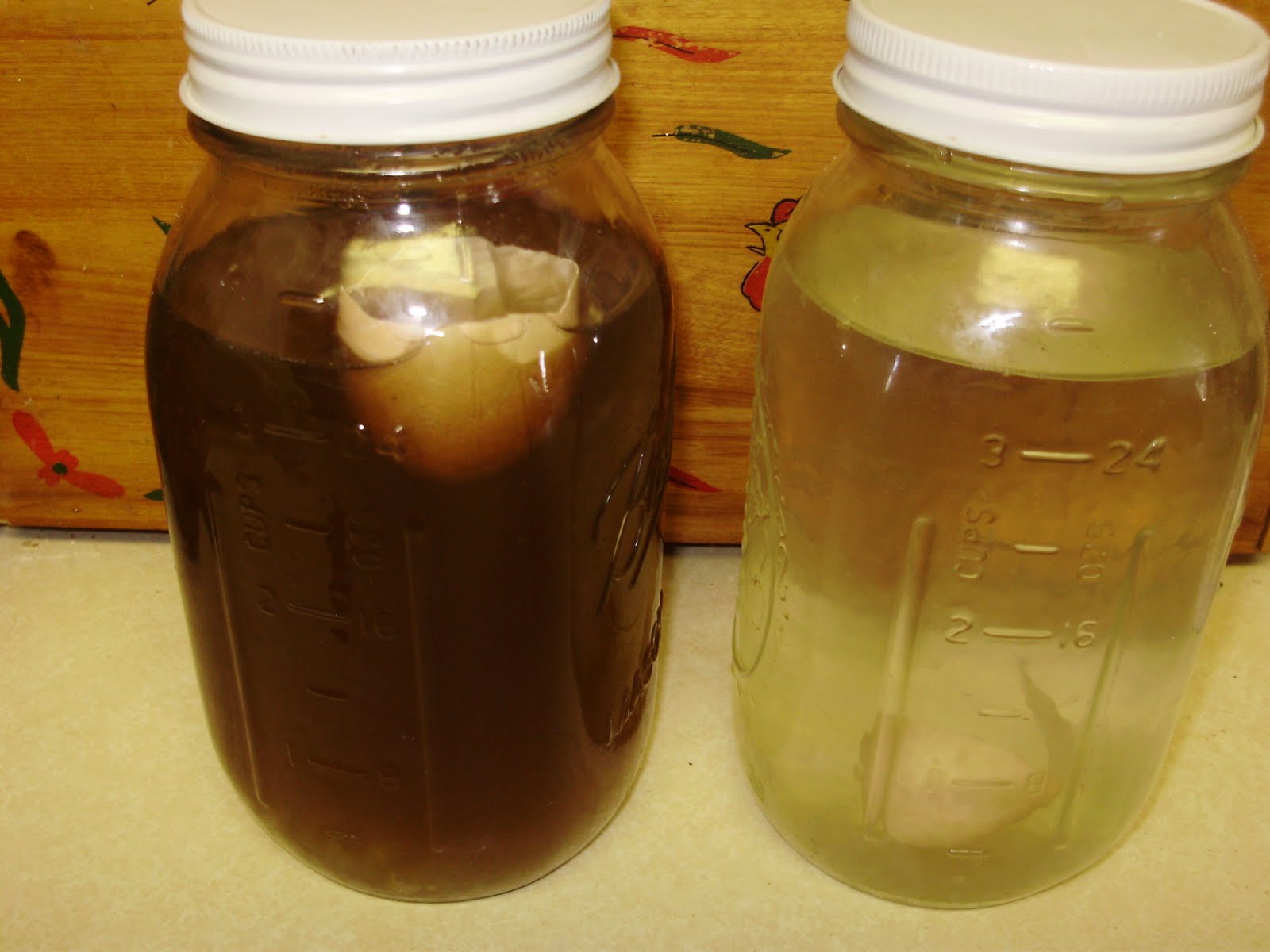 Here are a couple of gallons of Kombucha in process. I used two different kinds of teas which is why they look different. Kombucha gets used quite a bit here not only as a wonderfully tasty beverage but like the dairy kefir in whatever else I can smuggle it into. I love the flavor of kombucha so much that I use it as a substitute for wine in cooking fairly often. Our budget doesn’t allow us to buy wine very often and kombucha is cheap to make. We do lose the good probiotic benefits when cooking with it but it still tastes great.